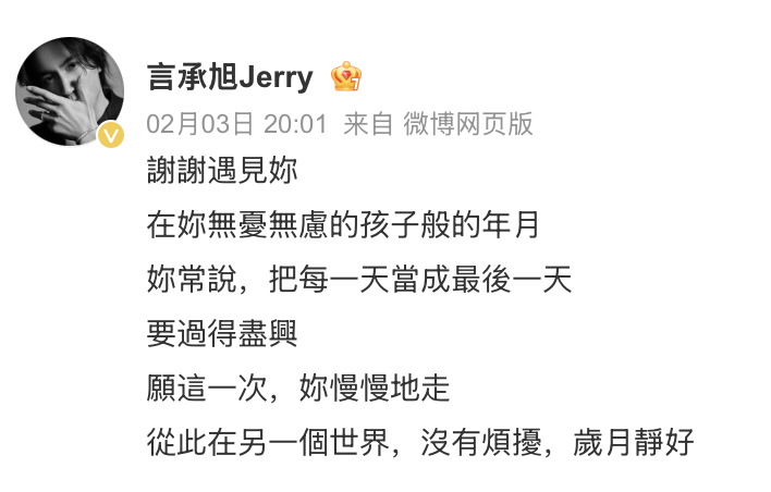 言承旭2月3日晚发文,告别大S徐熙媛。